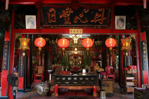 关帝古庙"丹心贯日"匾额两侧挂着泰国国王和王后的照片(关志杰摄影)
