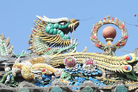 前殿龙庭中脊的“双龙抢珠”和“丹凤朝阳”剪瓷雕塑