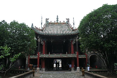 前门北是戏楼,两侧有供看戏饮筵用的坐楼,形成四合院,四围高大,音响不易扩散