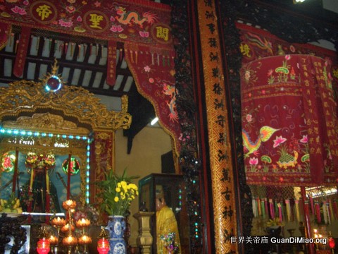 正殿内的关帝像两旁刻着著名的对联,关帝像左边为上联“生蒲州事豫州战徐州守荆州万古神州有一”