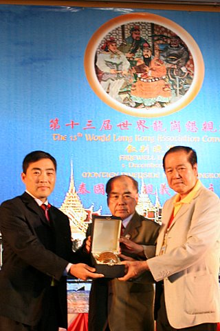 关公网站长关志杰接过泰国龙冈张永吉会长(中)和刘锦庭副会长(右)赠送的纪念礼品