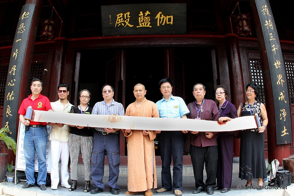 2012年6月15日,关公网献供一部由关公网钟顾问亲手镌刻的桃园明圣经金光箔长卷给玉泉寺(朱正明供稿)