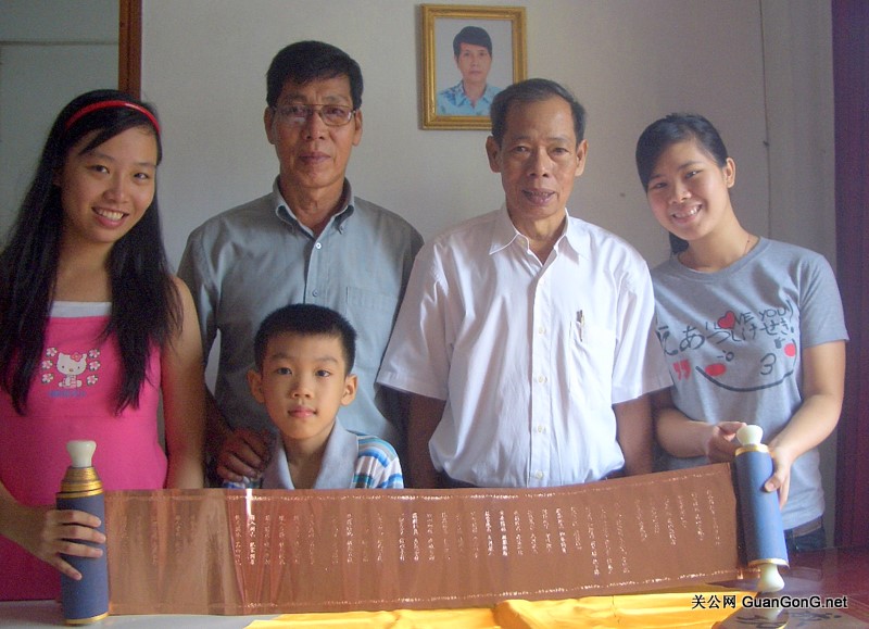李莹蔚和家人与《关圣帝君觉世真经》金卷合照