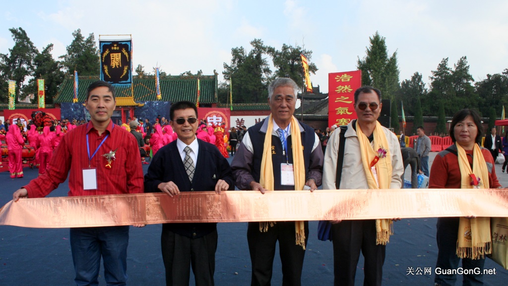 在关林庙前的关林国际朝圣大典现场,关公网站将一部依照清朝皇家规制镌刻的《关帝圣迹图志全集》金卷赠送给台湾桃园明圣经推广学会